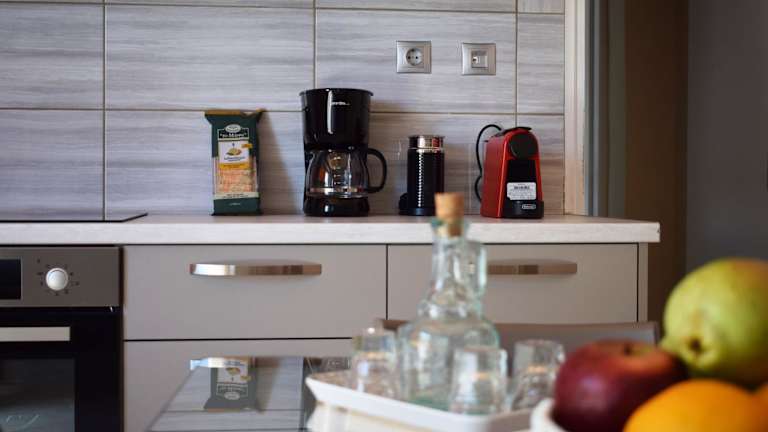 Das Ferienhaus ist klimatisiert und verfügt über zwei Schlafzimmer, ein Wohnzimmer und eine voll ausgestattete Küche, die mit einem Kühlschrank und einer Kaffeemaschine ausgestattet ist. Zudem gibt es ein Badezimmer mit Dusche. Handtücher und Bettwäsche sind vorhanden. Die Unterkunft bietet auch Einrichtungen für Familien, darunter ein Babybett für Kleinkinder.