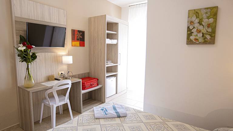 Die Zimmer im Hotel Aia Grande sind klassisch eingerichtet und verfügen über eine Terrasse mit Blick auf den Garten. Jedes Zimmer ist klimatisiert und mit Sat-TV und einer Minibar ausgestattet. Das eigene Bad bietet kostenlose Pflegeprodukte und einen Haartrockner. Genießen Sie den Komfort und die Gemütlichkeit dieser Zimmer während Ihres Aufenthalts.