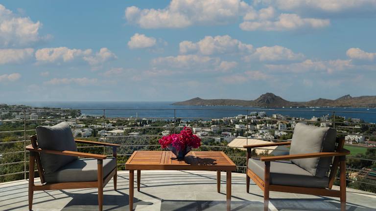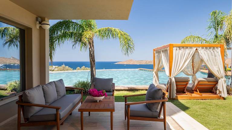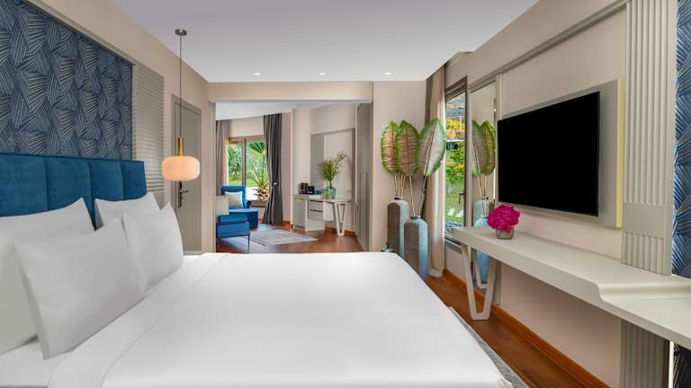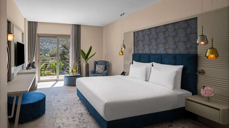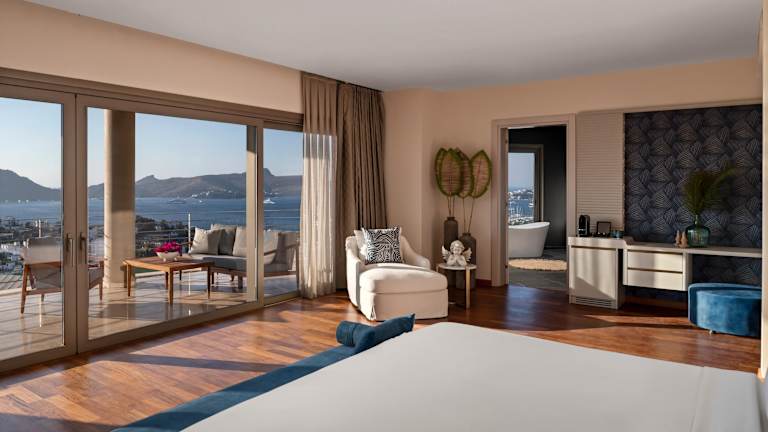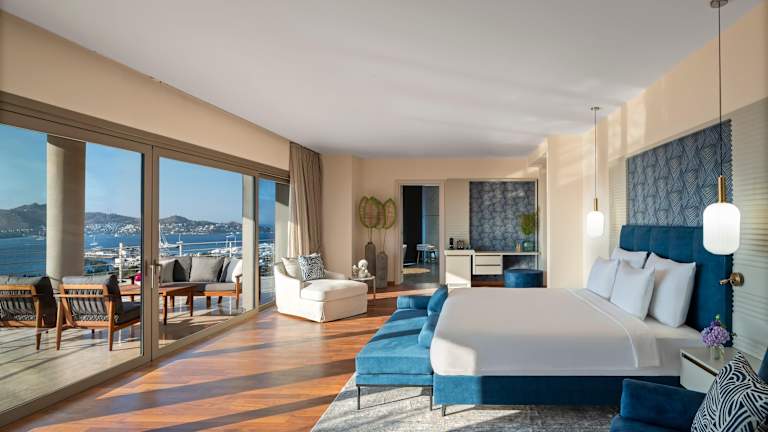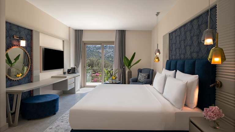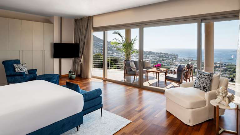 Die klimatisierten Zimmer des Hotels verfügen über einen Balkon oder eine Terrasse mit Meerblick. Zur Ausstattung gehören entweder ein Queensize-Bett oder ein Kingsize-Bett, eine Minibar, ein Safe, eine Tee-/Kaffeemaschine sowie ein TV-Gerät. Die Badezimmer sind mit einer Dusche und einer Badewanne ausgestattet. Ein Haartrockner sowie Bademäntel stehen ebenfalls zur Verfügung.