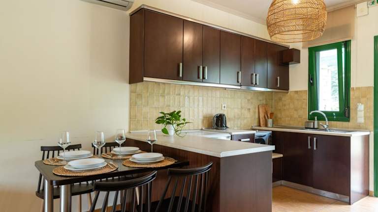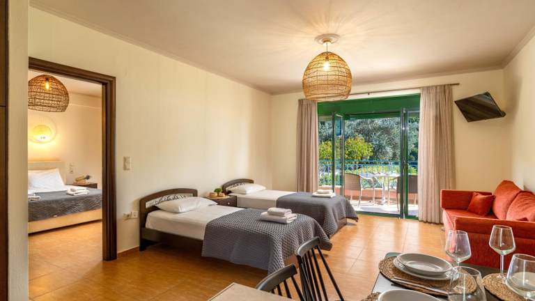 Die Wohneinheiten der Aiora Suites sind mit einem Sitzbereich, einem Satelliten Flachbild-TV und einer voll ausgestatteten Küche eingerichtet, die unter anderem Kühlschrank und Ofen umfasst. Des Weiteren verfügen die Zimmer über ein eigenes Badezimmer mit Dusche und Haartrockner. Alle Wohneinheiten sind mit einem Balkon ausgestattet, der Blick auf den Garten ermöglicht.