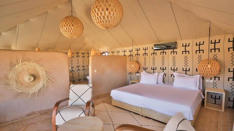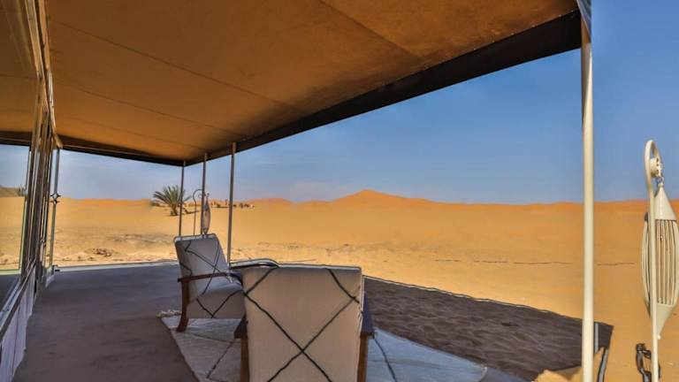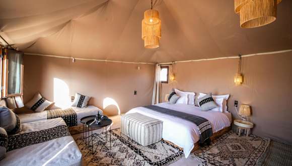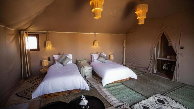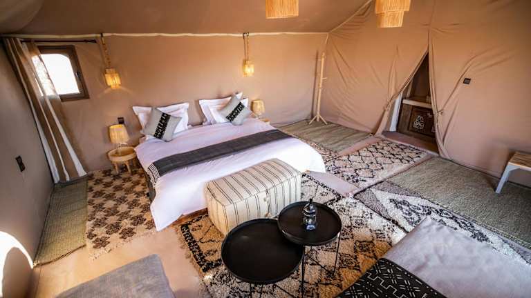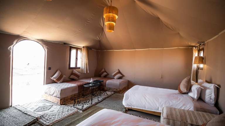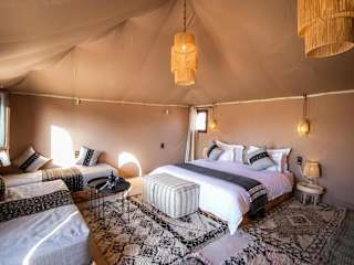 Das Aiour Luxury Camp liegt in Merzouga, einer malerischen Wüstenstadt in Marokko. Von hier aus haben Sie einen atemberaubenden Blick auf die umliegenden Berge und können die Schönheit der Wüste hautnah erleben. Das Camp ist der ideale Ausgangspunkt, um die Gegend zu erkunden und Aktivitäten wie Skifahren in der Nähe zu genießen. Der nächste Flughafen, der Flughafen Moulay Ali Cherif, liegt etwa 119 km entfernt und das Camp bietet einen kostenpflichtigen Flughafentransfer an.