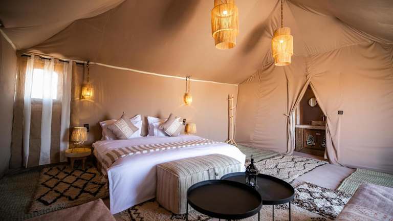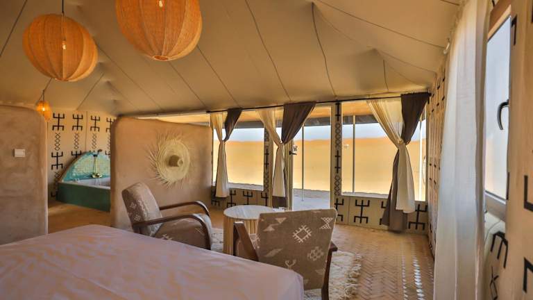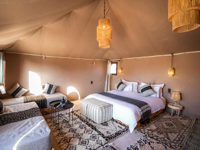 Das Aiour Luxury Camp in Merzouga ist der perfekte Ort, um einen luxuriösen und unvergesslichen Aufenthalt in der Wüste zu erleben. Mit klimatisierten Zelten, einem schönen Garten, einem Restaurant und kostenfreiem WLAN bietet das Camp alle Annehmlichkeiten, die man sich wünschen kann. Das freundliche und mehrsprachige Personal steht Ihnen rund um die Uhr zur Verfügung und sorgt dafür, dass Ihr Aufenthalt unvergesslich wird. Das Camp bietet auch die Möglichkeit, ein Auto zu mieten, um die Umgebung zu erkunden.