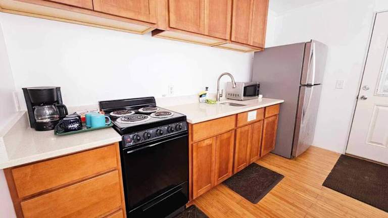 Die Villa umfasst 1 Schlafzimmer, ein Wohnzimmer und eine voll ausgestattete Küche mit Kühlschrank und Herdplatte. Handtücher und Bettwäsche werden bereitgestellt.