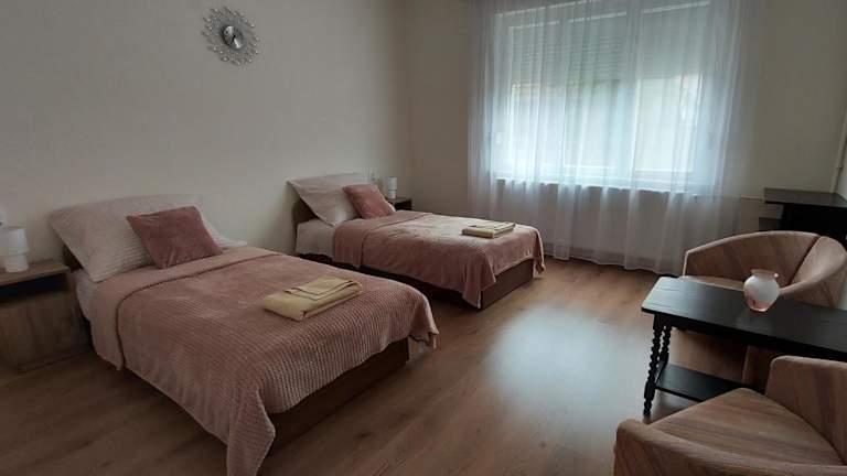 Das Apartment im Akácfa Vendégház bietet Ihnen ein gemütliches Zuhause auf Zeit. Es verfügt über 2 Schlafzimmer, ein geräumiges Wohnzimmer und eine gut ausgestattete Küche. Die Terrasse bietet einen schönen Blick auf den Garten und lädt zum Entspannen ein. Handtücher und Bettwäsche werden gestellt, damit Sie sich wie zu Hause fühlen können. Kostenloses WLAN ist ebenfalls verfügbar.
