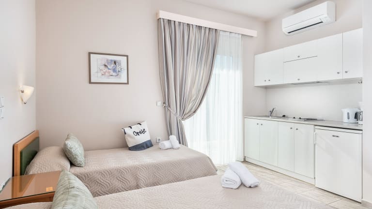 Die Akti Suites befinden sich in günstiger Lage, nur 100 m vom Strand Agii Apostoli entfernt. Dieser schöne Strand bietet kristallklares Wasser und ist ideal zum Schwimmen und Sonnenbaden. In der Umgebung finden Sie auch eine Auswahl an Restaurants und Bars, in denen Sie lokale Küche und Getränke genießen können. Die Stadt Chania mit ihren charmanten Gassen und dem venezianischen Hafen ist nur 4 km entfernt und der Hafen von Souda ist nach einer kurzen Fahrt von 10 km erreichbar. Der internationale Flughafen von Chania liegt etwa 20 km entfernt.
