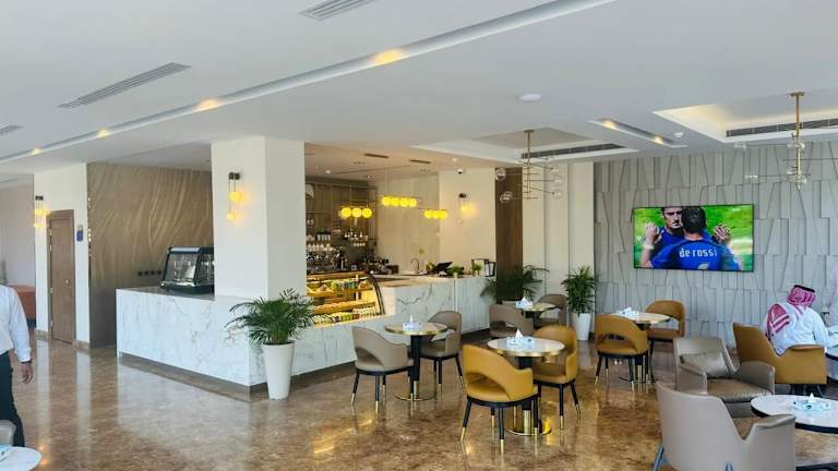 Der gastronomische Bereich des Al Ertiqaa Hotels umfasst ein Restaurant und ein Café, in dem ein reichhaltiges Frühstück in Buffetform angeboten wird.