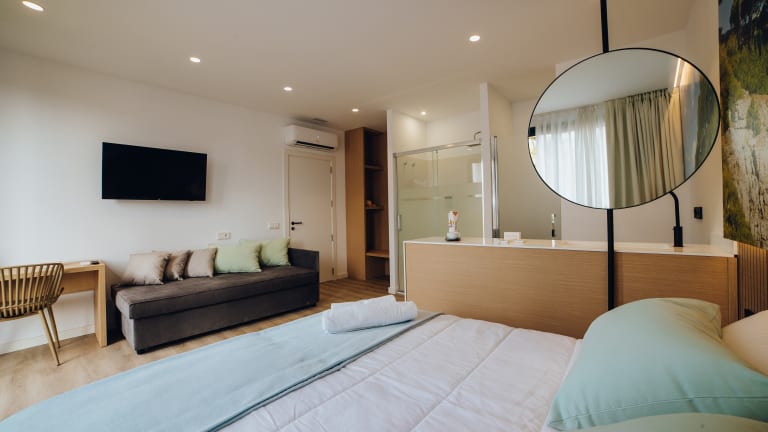 Es gibt insgesamt 346 Zimmer, die in 4 verschiedenen Typologien verteilt sind und sich an der natürlichen Umgebung der Gegend orientieren. Der wichtigste und differenzierende Wert, den sie den Gästen bieten, ist ihr Design, das sich an die Bedürfnisse jeder Person und jedes Familienkerns anpasst, indem es die Möglichkeit bietet, eines mit dem anderen zu verbinden und so einen großen suiteartigen Raum zu schaffen. Die Dekoration der Zimmer ist von der natürlichen Umgebung in der Nähe des Resorts inspiriert und hebt den Reichtum der Stadt hervor; unübersehbare Orte, die die Gäste entdecken und besuchen können, indem sie den QR-Code auf den Kopfenden der Betten scannen. Zur Unterhaltung der Kleinen stehen außerdem die Alan Adventure Zimmer zur Verfügung, die über einen eigenen Spielbereich verfügen und den Aufenthalt zu einem Abenteuer machen: Nature Room: Fühlen Sie sich in einem Zimmer im ersten Stock wie auf dem Meer, in den Bergen oder im Himmel. Sein innovatives Design versetzt Sie wie nie zuvor in eine mediterrane Landschaft. Genießen Sie die Freiheit in einem geräumigen Zimmer mit dem natürlichen Licht der Costa Dorada. Gartenzimmer: Ein 360º-Naturerlebnis, das ist es, was das Gartenzimmer Sie fühlen lässt. Ein Garten in einer Oase, der Sie in eine natürliche Umgebung eintauchen lässt, ohne das Zentrum von Salou zu verlassen. Erleben Sie einen revolutionären Aufenthalt in diesem Zimmer, umgeben von authentischer mediterraner Vegetation. Mit der Familie verbunden: Ein Traumplatz für eine Familie, die in einer einzigartigen Oase doppelt so viel Spaß haben möchte. Das Vergnügen, in einem Raum zu leben, der mit Ihren Lieben und der Natur verbunden ist. Genießen Sie diesen Raum, in dem Sie in jeder Ecke mit der mediterranen Schönheit in Verbindung treten können. Alan Abenteuer: Das Abenteuer, das jedes Kind gerne zusammen mit Alan und Dolça erleben würde. Eine zusammenhängende Suite, die den Spaß des Alannia Salou und die Natur der Costa Dorada vereint. Der spektakulärste Raum, der einen exklusiven Spielbereich und die Ruhe einer Oase vereint. Der perfekte Rahmen für ein unvergessliches Familienerlebnis.