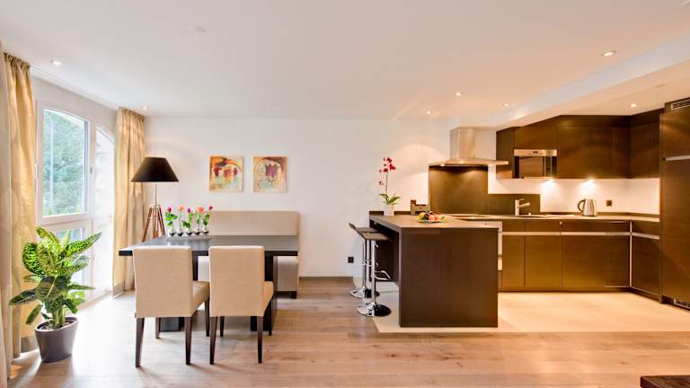 Die lichtdurchfluteten Apartments sind luxuriös gestaltet und mit schwarzem Marmor, Hartholzböden und Natursteinmauern ausgestattet. Zusätzlich sind Babybetten und Babyphone verfügbar.