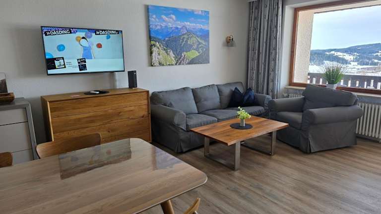 Die Ferienwohnung verfügt über ein Schlafzimmer, ein Wohnzimmer, einen Flachbild-TV und eine gut ausgestattete Küche mit Kühlschrank und Geschirrspüler. Ein Badezimmer mit Dusche, ein Balkon mit Blick auf die Berge sowie die Bereitstellung von Handtüchern und Bettwäsche gehören ebenfalls zur Ausstattung.