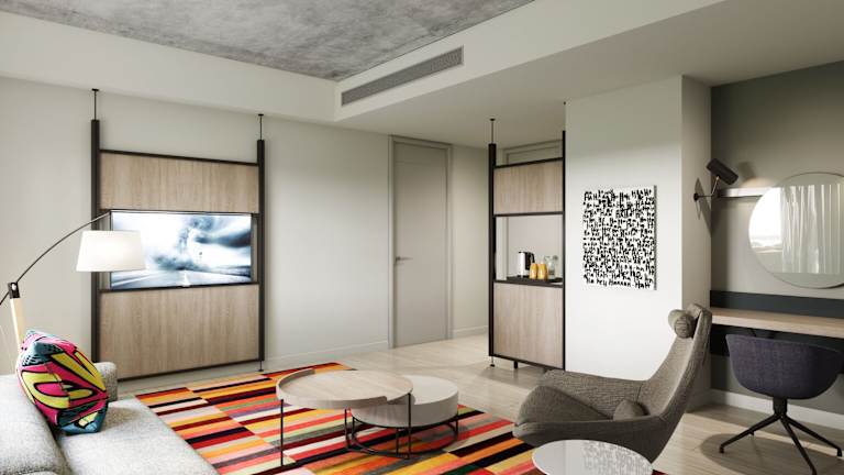 Die Zimmer sind klimatisiert und verfügen über ein Kingsizebett, ein Sofabett sowie die Möglichkeit für Zustellbetten. Zur Zimmerausstattung gehören ein Safe, ein Schreibtisch, eine Tee-/Kaffeemaschine, ein Flachbild-TV mit Satellitenkanälen, ein Badezimmer mit Dusche und kostenlosen Pflegeprodukten. Es sind auch barrierefreie Zimmer verfügbar.