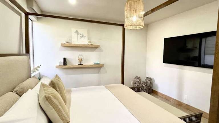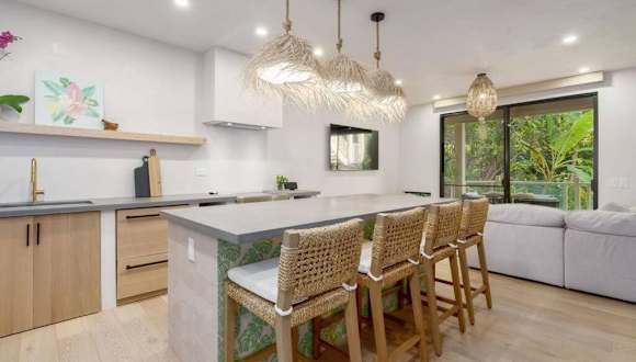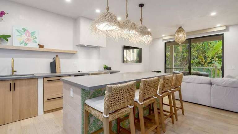 Das Aloha Moon - A Chic and Dreamy Modern Tropical Hideaway! bietet ein klimatisiertes Apartment mit einem Schlafzimmer. Die Unterkunft ist modern und stilvoll eingerichtet und verfügt über eine voll ausgestattete Küche mit Kühlschrank und Geschirrspüler. Ein Flachbild-TV und ein gemütlicher Sitzbereich sorgen für Unterhaltung und Komfort. Das Apartment verfügt über ein Badezimmer mit Dusche und es werden Handtücher und Bettwäsche gestellt. Kostenloses WLAN und Privatparkplätze stehen zur Verfügung.