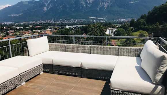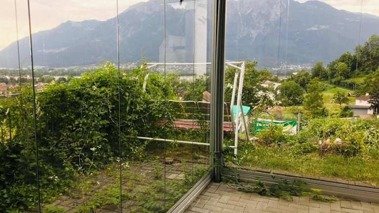 Alpen Panorama view Luxury House with green Garden bietet eine helle und freundliche Atmosphäre mit Gartenblick, einem Balkon und modernen Annehmlichkeiten. Die Unterkunft ist für eine Erholung in einer ruhigen Umgebung konzipiert und bietet Platz für eine Gruppe oder Familie.