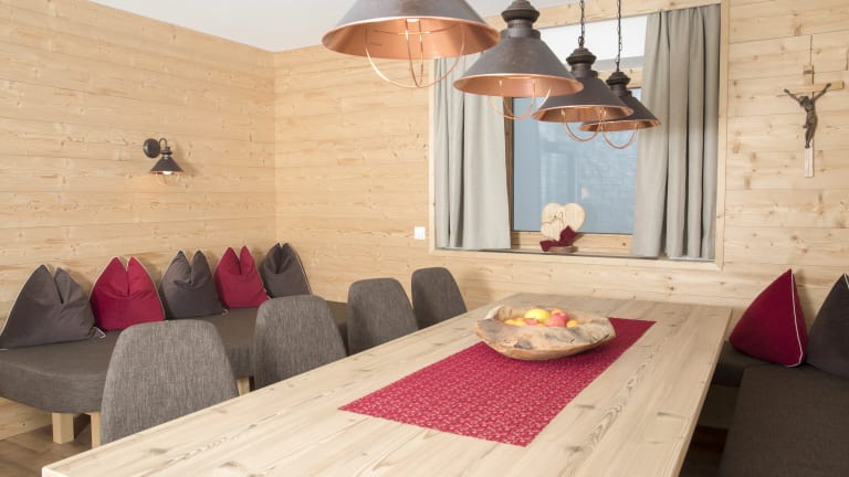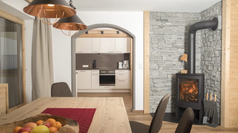 Chalet ALPENGLÜCK große Gastroküche mit großem Gasherd, Backofen, Kühlschrank mit Gefrierfach, Geschirrspüler, Kaffeemaschine, Aufschnittmaschine, Toaster und Wasserkocher 2 große Wohnstuben mit Tischen und Stühlen, in einer Stube TV-Ecke mit gemütlichem Sofa Chalet ALPENHOAMTL Küche mit E-Herd mit Backofen, Kühlschrank, Geschirrspüler, Kaffeemaschine, Toaster und Wasserkocher Wohn- Essbereich mit Schwedenofen