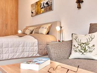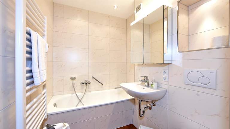 Die Ferienwohnung verfügt über ein Wohnzimmer mit Sitz- und Essbereich, eine Küchenzeile mit Kühlschrank, Geschirrspüler und Ofen, ein Schlafzimmer sowie zwei Badezimmer, die mit Dusche und Badewanne ausgestattet sind. Handtücher und Bettwäsche werden bereitgestellt.
