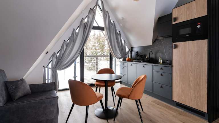 Die Zimmer in der Alpina Residence & Kameralne SPA sind mit einem Balkon, Bergblick, einem Sitzbereich, einem Satelliten-Flachbild-TV sowie einer voll ausgestatteten Küchenzeile ausgestattet. Zu den Annehmlichkeiten gehören ein Kühlschrank, ein Geschirrspüler, eine Mikrowelle, eine Herdplatte und ein Wasserkocher. Jedes Zimmer hat ein eigenes Badezimmer mit Dusche und kostenlosen Pflegeprodukten.