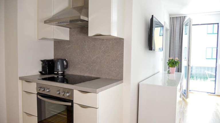 Die Ferienwohnung verfügt über eine voll ausgestattete Küche, die mit einem Kühlschrank und einer Kaffeemaschine ausgestattet ist.