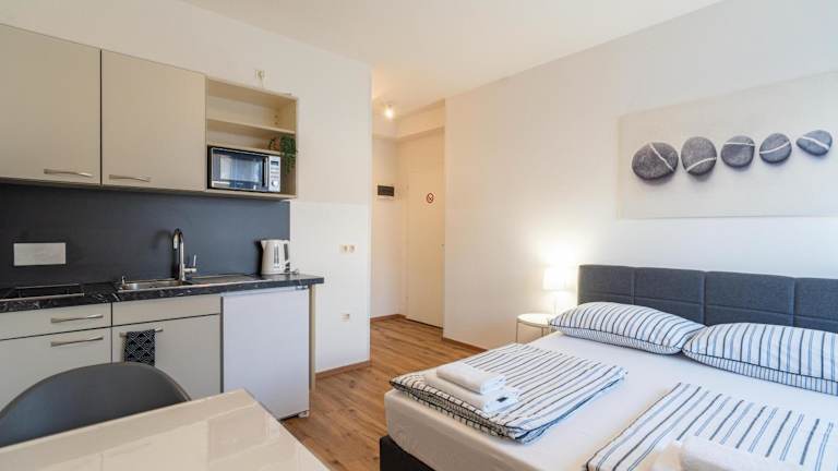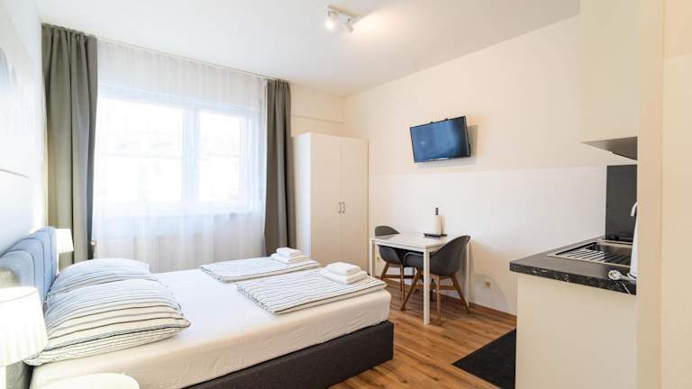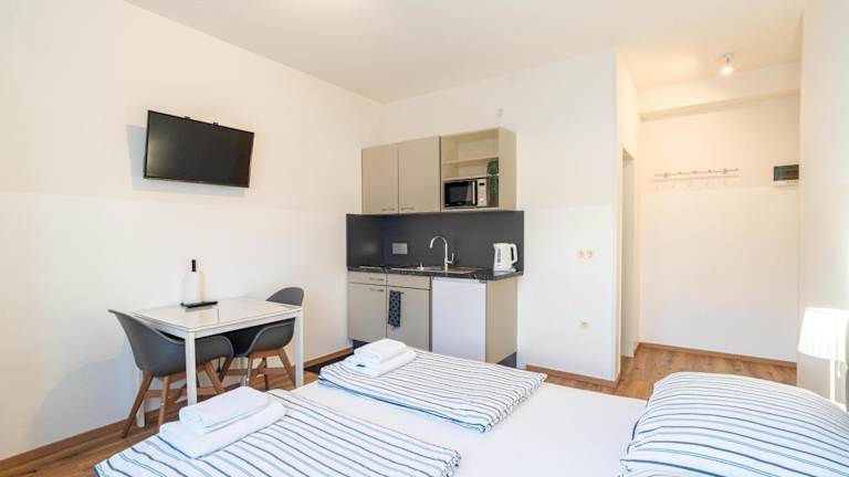 Die Ferienwohnung verfügt über ein Schlafzimmer und bietet kostenfreies WLAN. Zur Ausstattung gehören ein Flachbild-TV sowie eine Küche, die mit einem Kühlschrank und einer Mikrowelle ausgestattet ist. Handtücher und Bettwäsche werden bereitgestellt.