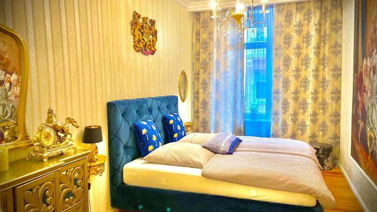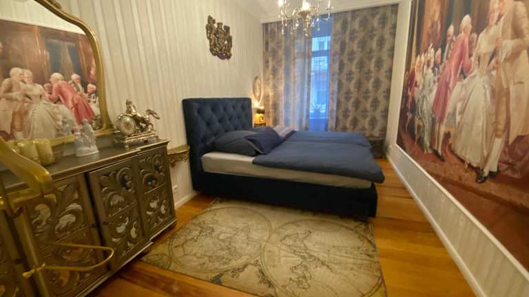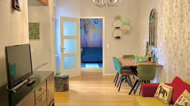 Das Apartment besteht aus zwei separaten Schlafzimmern, die Ihnen ausreichend Privatsphäre bieten. Das Badezimmer ist funktional und bietet alles, was Sie für Ihren Aufenthalt benötigen. Das gemütliche Wohnzimmer lädt zum Entspannen ein. Hier können Sie sich nach einem ereignisreichen Tag zurückziehen und die Atmosphäre der Altbauwohnung genießen.