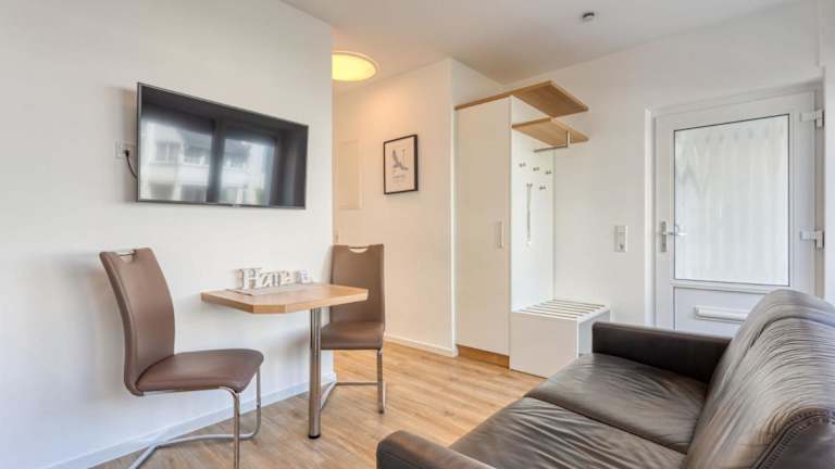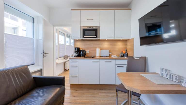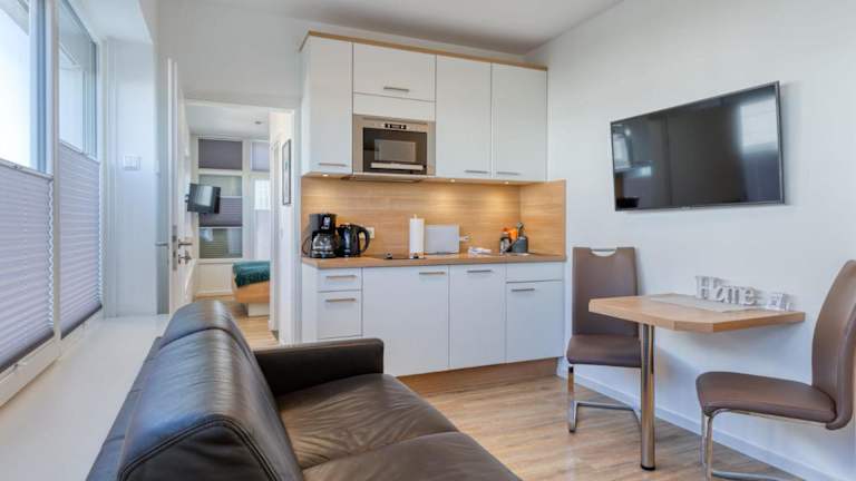Alte Teestube 69 2 Raum bietet Übernachtungsmöglichkeiten in Form einer Ferienwohnung. Die Einrichtung enthält einen Balkon, eine voll ausgestattete Küche sowie Zugang zu einer Sauna und einem Außenpool.