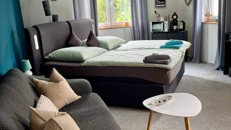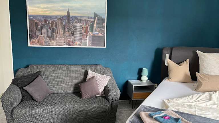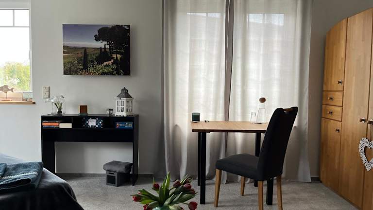 Das Alternative zum Hotel Zimmer im Einfamilienhaus-eigenes Badezimmer im Flur ist eine gemütliche und komfortable Unterkunft, die Ihnen einen entspannten Aufenthalt in einer ruhigen Umgebung bietet. Mit einem schönen Gartenblick und kostenfreiem WLAN können Sie hier Ihre Privatsphäre genießen. Die Unterkunft bietet auch Zugang zu Tischtennis und kostenfreien Privatparkplätzen.