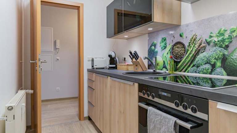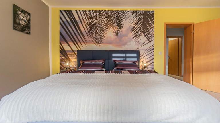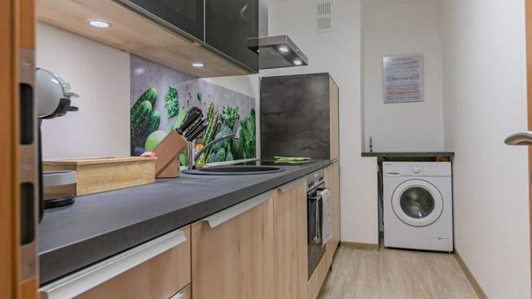 Die Ferienwohnung umfasst zwei Schlafzimmer und ein Wohnzimmer, das mit einem Flachbild-TV ausgestattet ist. Zusätzlich existiert eine voll ausgestattete Küchenzeile, die eine eigenständige Zubereitung von Mahlzeiten ermöglicht.