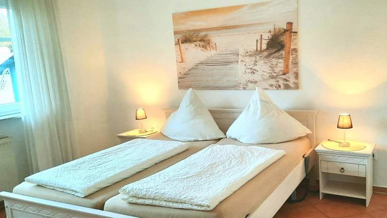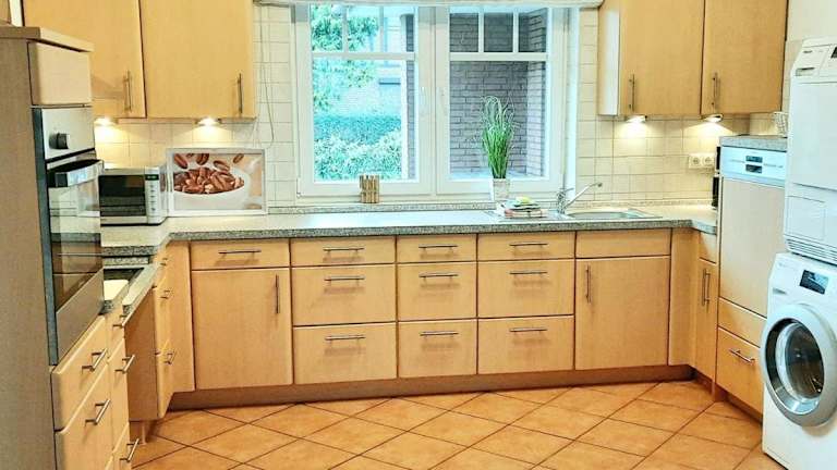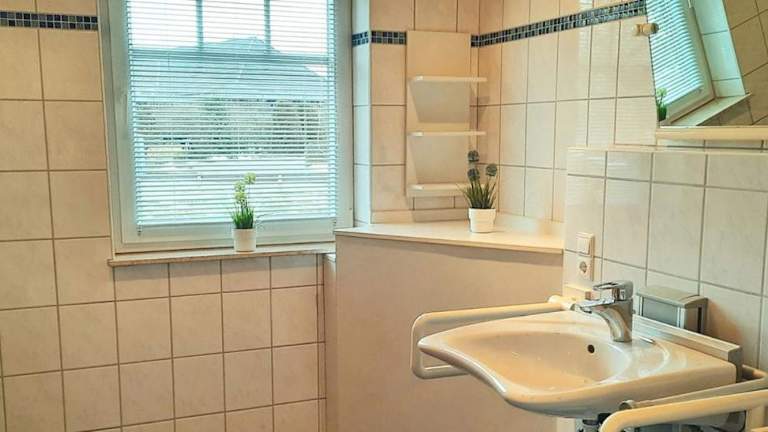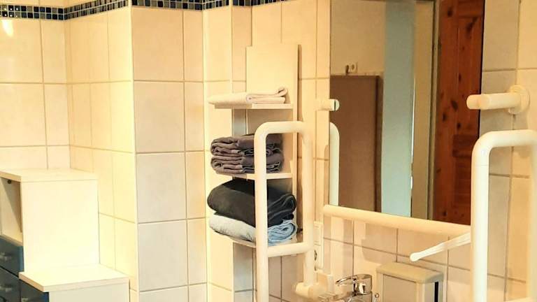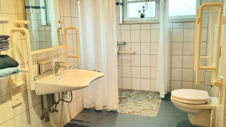 Die Ferienwohnung umfasst drei Schlafzimmer, eine Küche mit Kühlschrank und Geschirrspüler, einen Flachbild-TV, einen Sitzbereich sowie zwei Badezimmer mit Dusche. Zur Ausstattung gehören auch Handtücher und Bettwäsche. Die Unterkunft ist rollstuhlgerecht und bietet spezielle Einrichtungen wie ein WC mit Haltegriffen und eine Notrufleine im Bad.