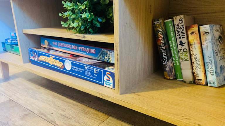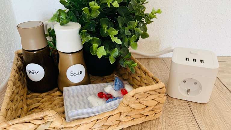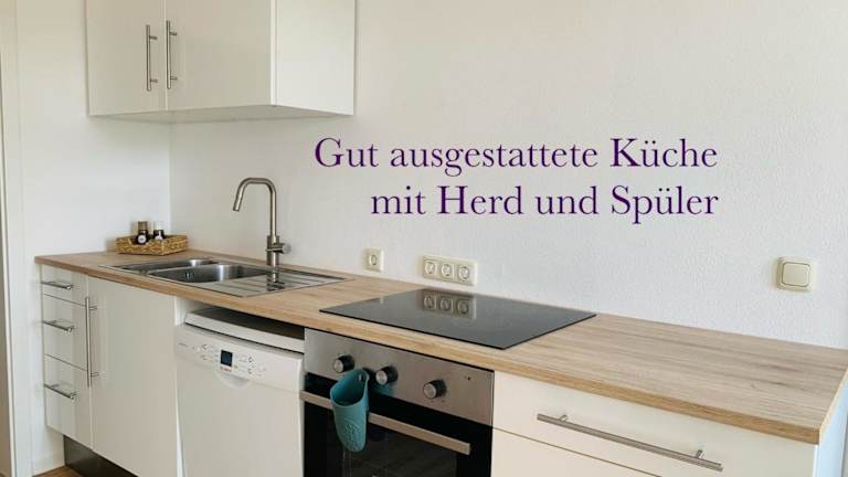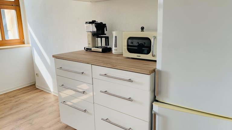 Die Ferienwohnung beinhaltet eine voll ausgestattete Küche mit einem Kühlschrank und einer Kaffeemaschine, die die Zubereitung eigener Mahlzeiten ermöglicht.