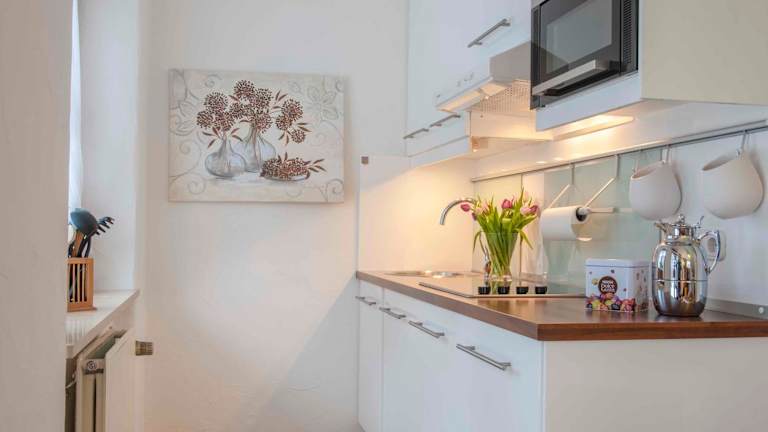 Die Ferienwohnung bietet ein Schlafzimmer, ein Wohnzimmer mit Flachbild-TV, eine gut ausgestattete Küche mit Kühlschrank und Geschirrspüler sowie ein Badezimmer mit Dusche. Handtücher und Bettwäsche sind ebenfalls vorhanden. Die Terrasse ermöglicht einen Blick auf die Berge.