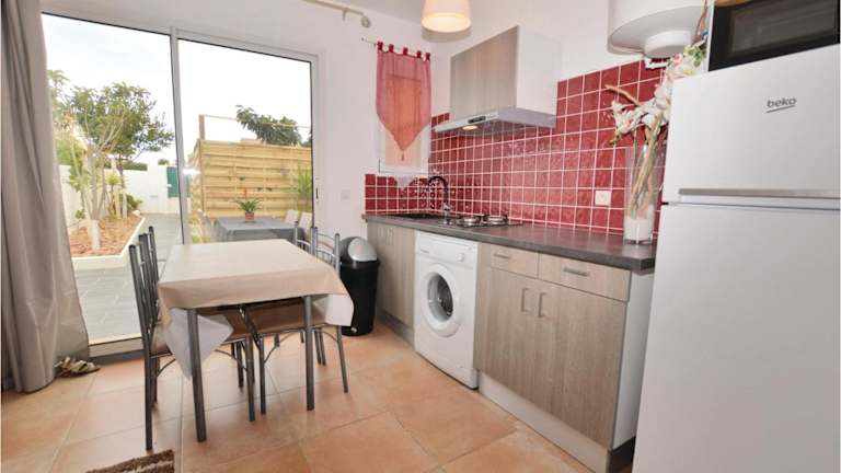 Das Ferienhaus bietet ein Wohnzimmer sowie eine voll ausgestattete Küche. Des Weiteren ist ein Kühlschrank, eine Mikrowelle und ein TV vorhanden.