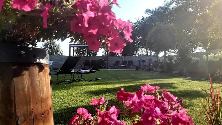 Die Ferienwohnung umfasst 1 Schlafzimmer, 1 Badezimmer, Bettwäsche, Handtücher, einen Flachbild-TV, eine voll ausgestattete Küche und eine Terrasse mit Gartenblick.