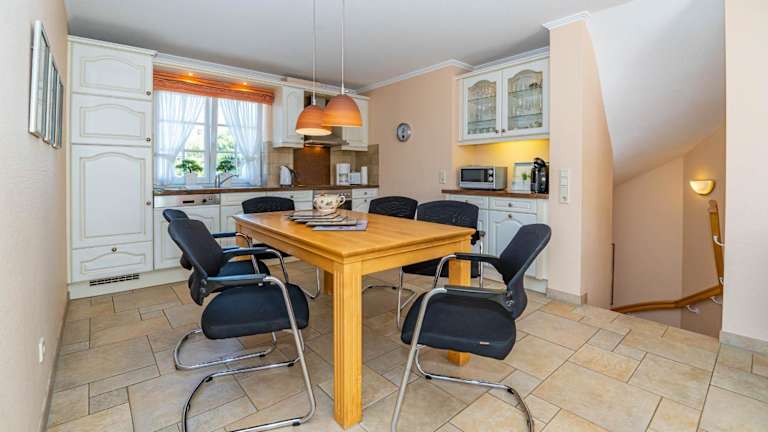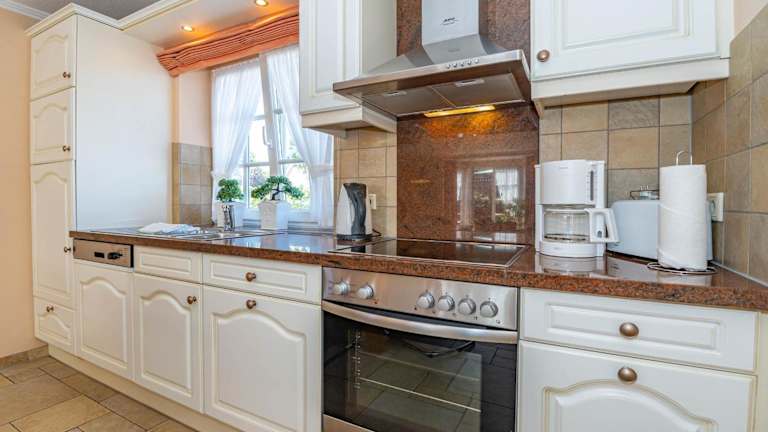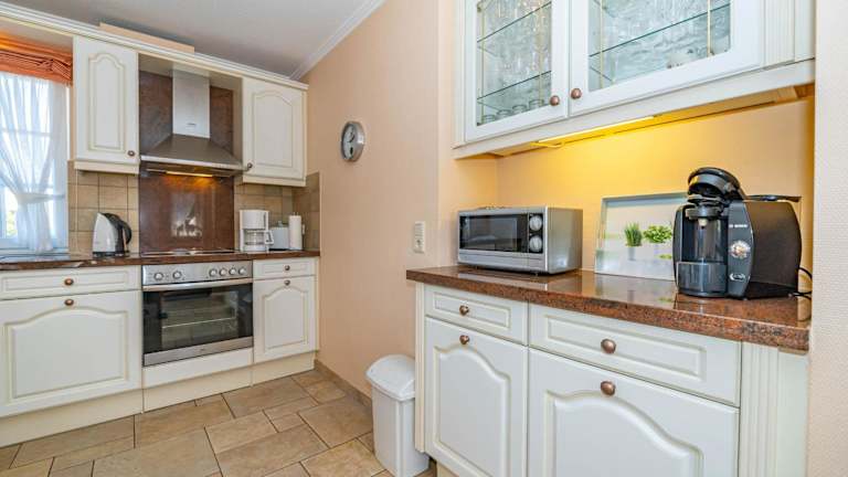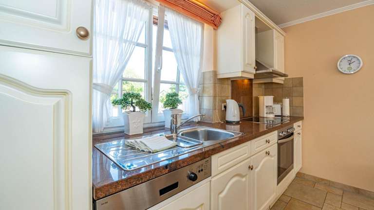 Die Ferienwohnung bietet eine voll ausgestattete Küche, die mit Kühlschrank, Geschirrspüler, Waschmaschine, Ofen und Mikrowelle ausgestattet ist. Handtücher und Bettwäsche werden den Gästen bereitgestellt.