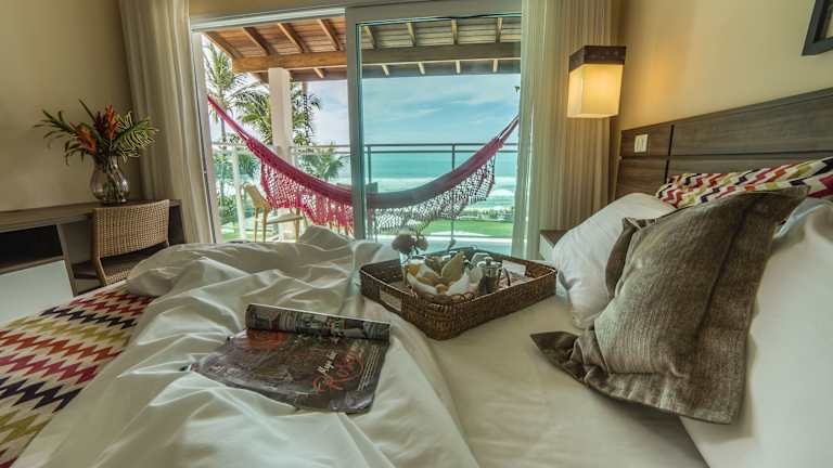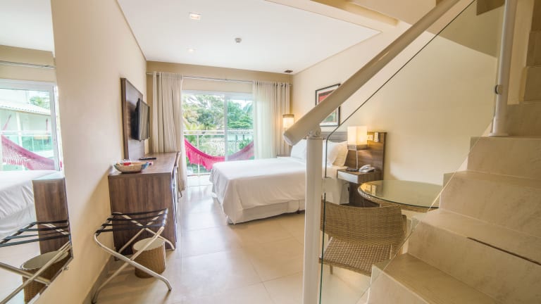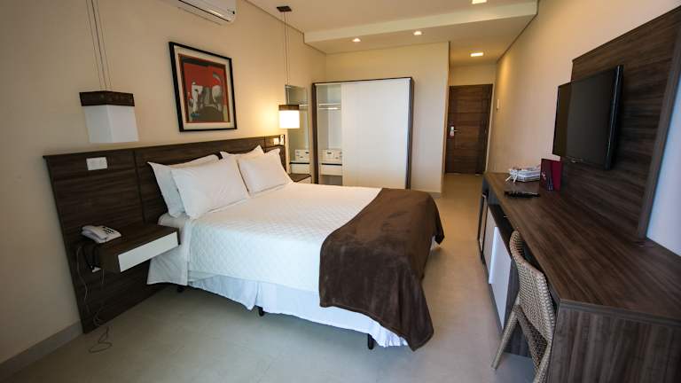Die in neutralen Farben gestalteten Zimmer des Amora Hotel Maresias sind komfortabel eingerichtet und verfügen über Klimaanlage, einen 39-Zoll-LED-Fernseher mit Kabelkanälen und einem Blu-ray-Player, einen Safe, eine Minibar, ein Telefon sowie ein eigenes Bad mit Haartrockner.
