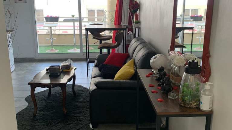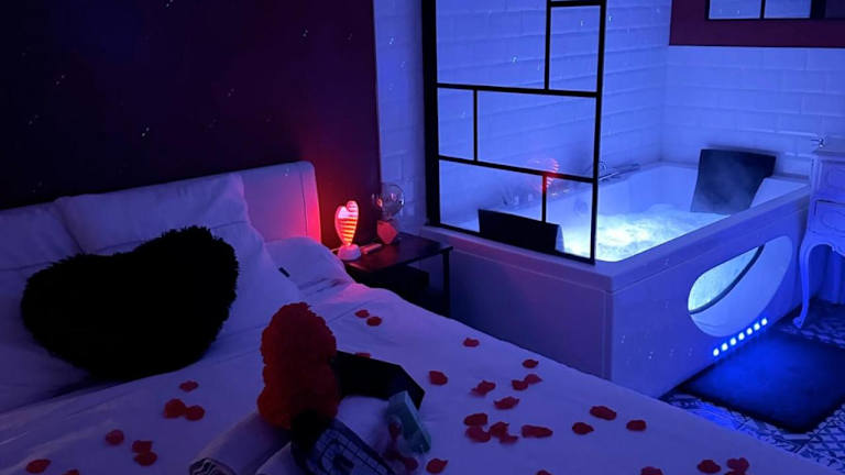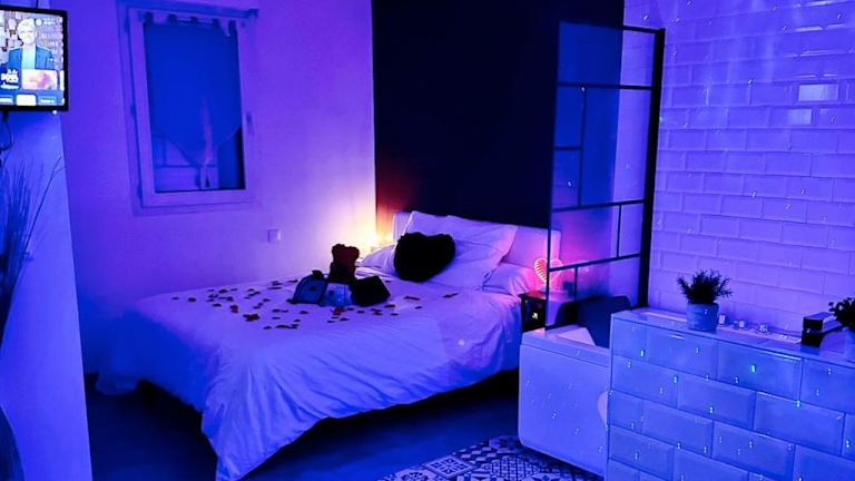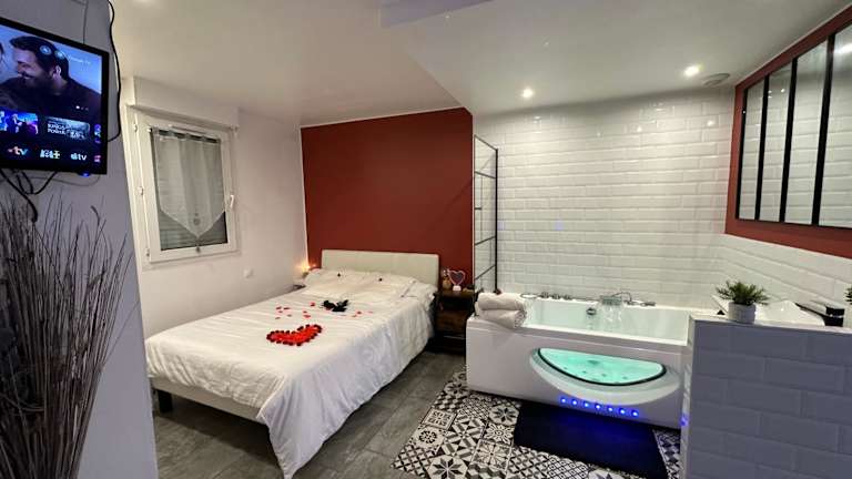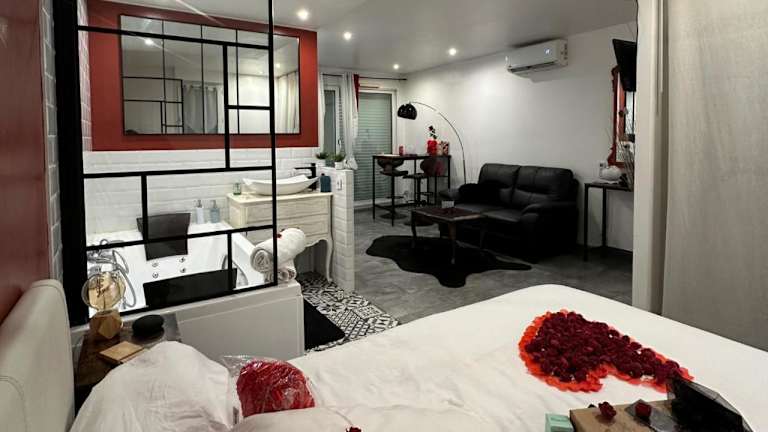 Amour Azur Appartement pour 2 avec jacuzzi et terrasse à 2 minutes de la mer bietet Übernachtungsmöglichkeiten mit kostenlosem WLAN, Klimaanlage, einem saisonalen Außenpool und einer Terrasse. Die Unterkunft bietet einen Blick auf das Meer.