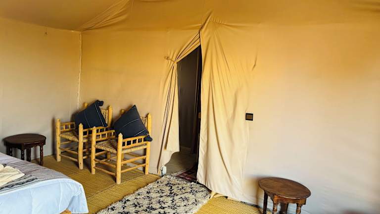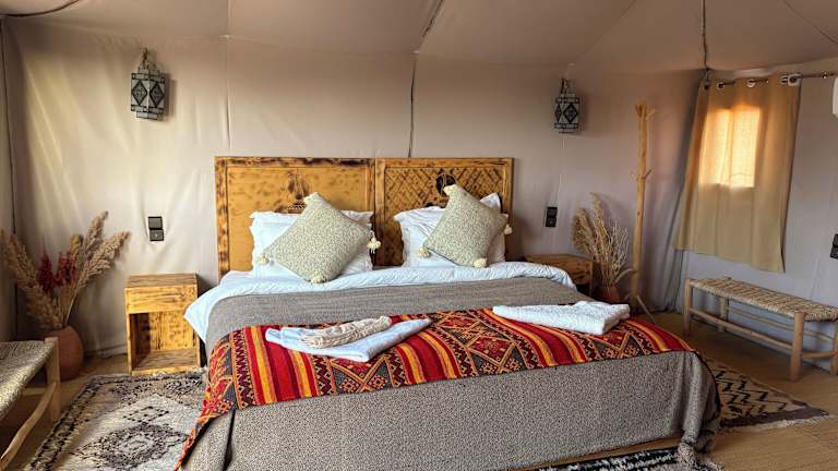 Die luxuriösen Zelte im Amskou Camp bieten Ihnen einen komfortablen Aufenthalt inmitten der Natur. Jedes Zelt ist voll ausgestattet und verfügt über ein eigenes Bad mit Bidet und Hausschuhen. Hier können Sie sich wie zu Hause fühlen und dennoch den einzigartigen Charme des Camps genießen.