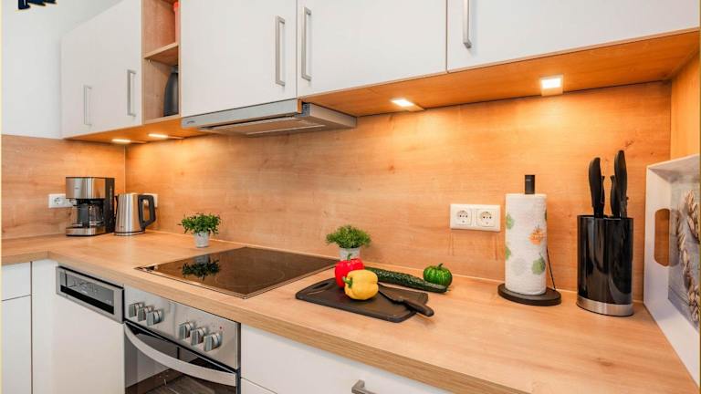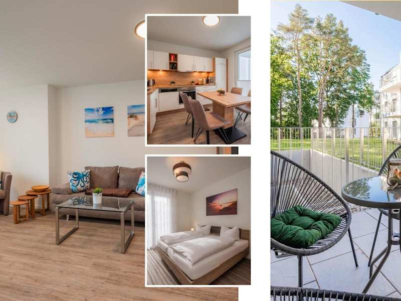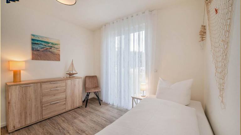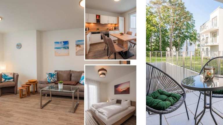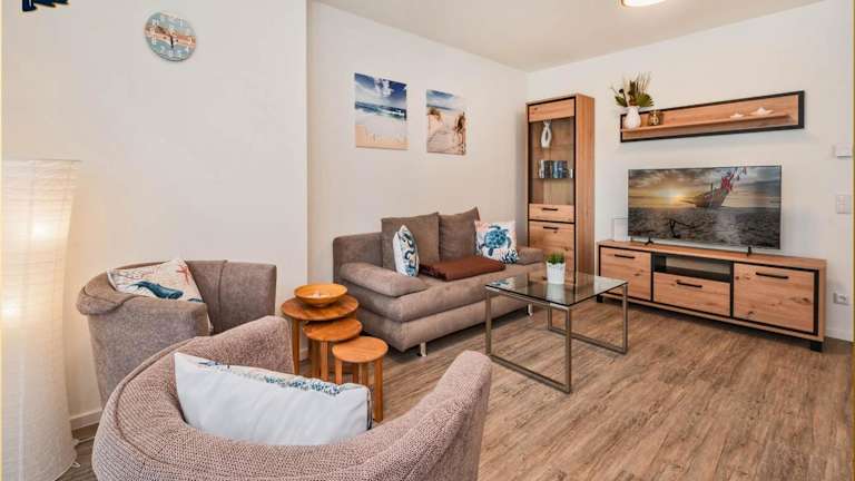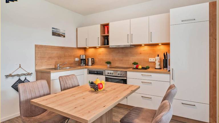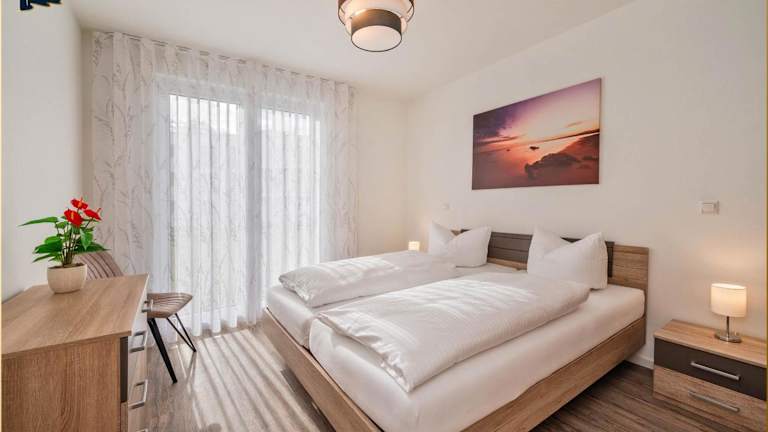 Die Ferienwohnung verfügt über eine Terrasse, zwei Schlafzimmer, ein Wohnzimmer sowie eine gut ausgestattete Küche mit Kühlschrank und Geschirrspüler. Ein Flachbild-TV mit Kabelkanälen ist ebenfalls vorhanden.