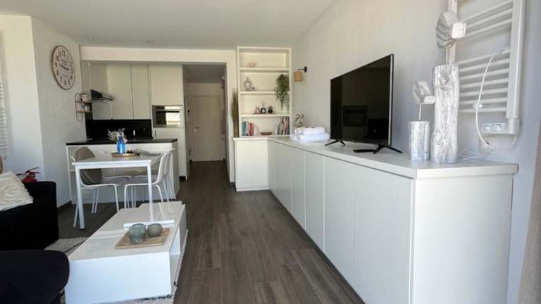 Die Unterkunft bietet einen Balkon, einen Sitzbereich sowie einen Kabel Flachbild-TV. Die Küche verfügt über moderne Geräte, darunter einen Kühlschrank und einen Geschirrspüler.