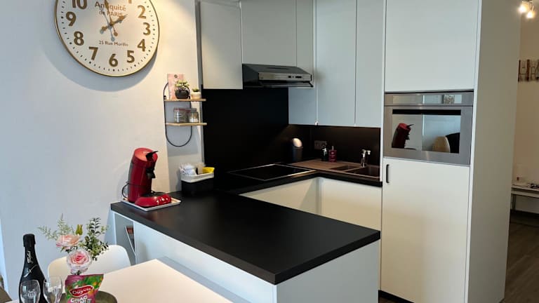 Die Ferienwohnung ist mit einer Küche ausgestattet, die über einen Kühlschrank, Geschirrspüler, Ofen, Kaffeemaschine und Wasserkocher verfügt. Es sind keine weiteren Informationen zur Verpflegung verfügbar.