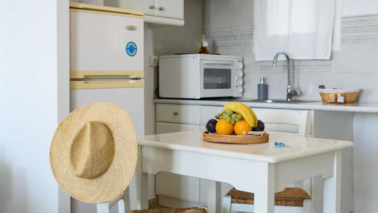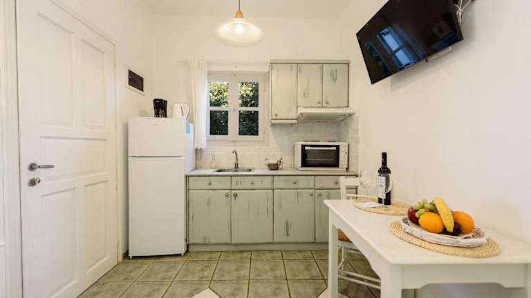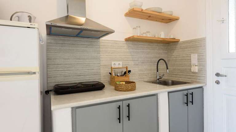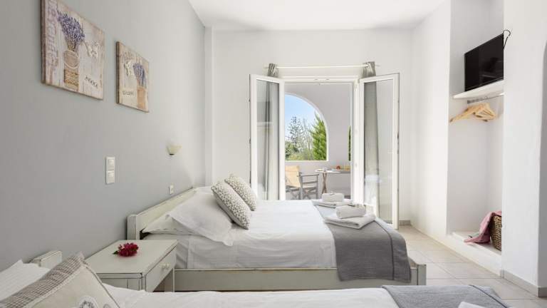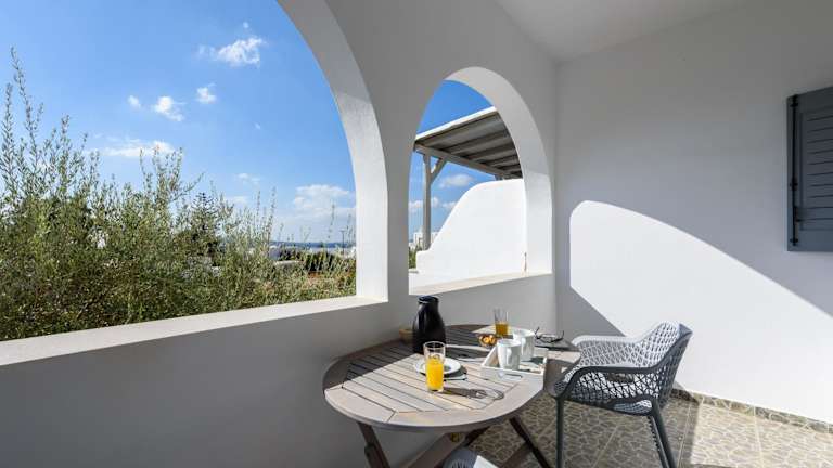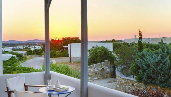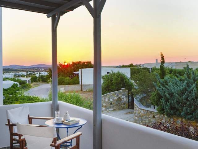 Alyki, 350 m vom Strand entfernt in einer Gartenanlage mit Bougainvilleen, Geranien und Olivenbäumen. Der internationale Flughafen Paros ist 3 km entfernt und eine Bushaltestelle befindet sich in 50 m Entfernung. Zum Strand von Faraggas gelangen Gäste nach 1 km.