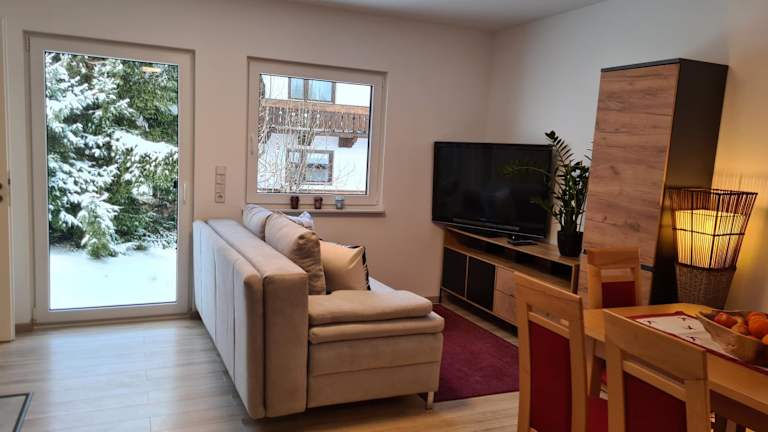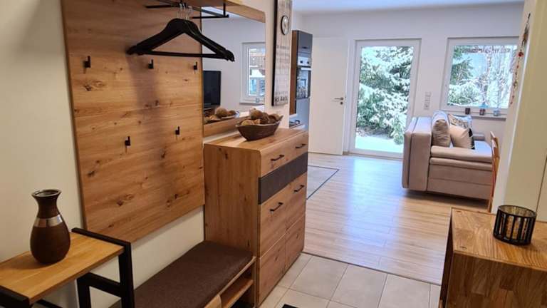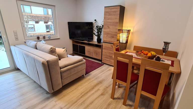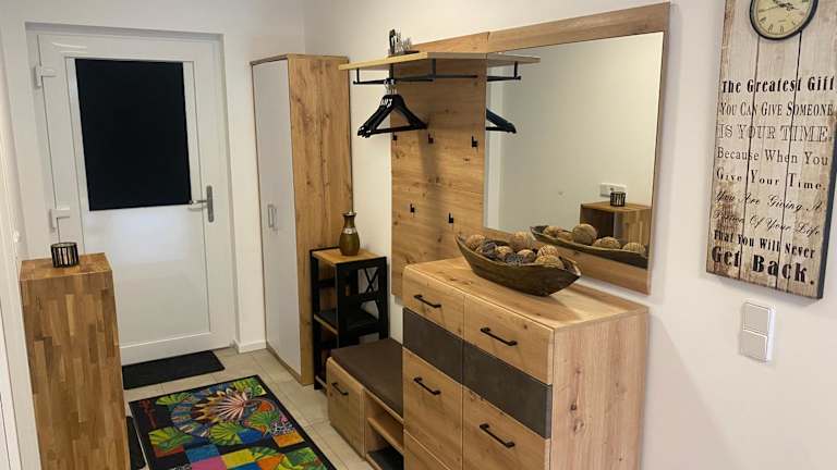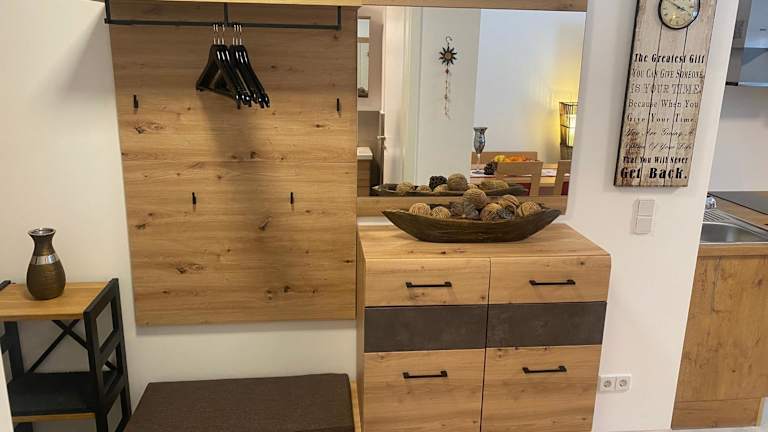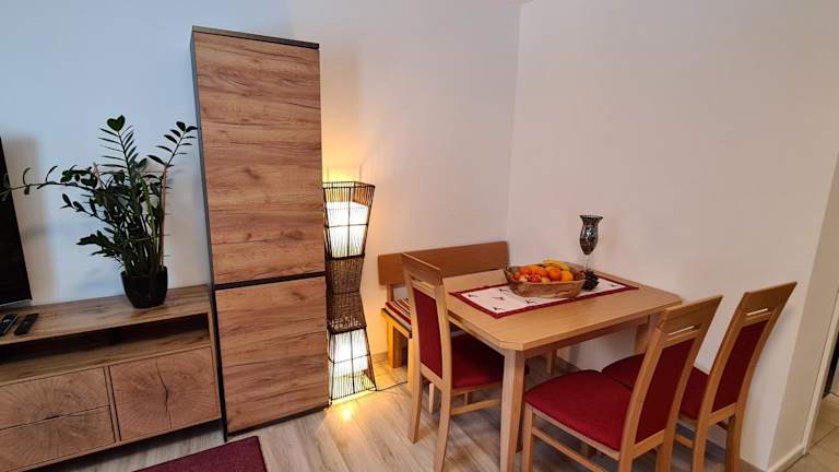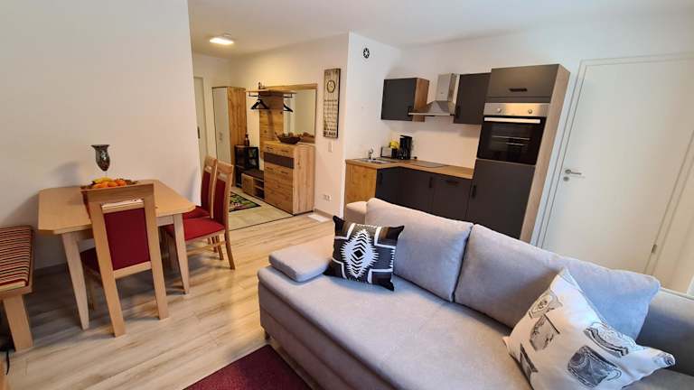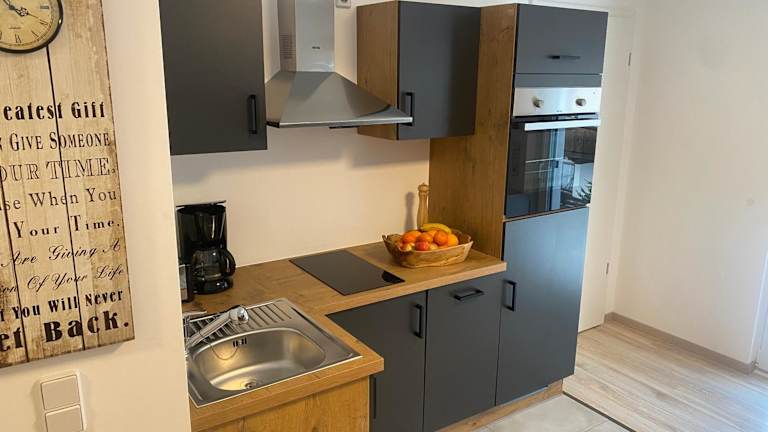 Die Ferienwohnung besteht aus einem Schlafzimmer, einem Wohnzimmer und einer voll ausgestatteten Küchenzeile mit Kühlschrank und Kaffeemaschine. Das Badezimmer ist mit einer Dusche und einem Haartrockner ausgestattet. Handtücher und Bettwäsche werden bereitgestellt.