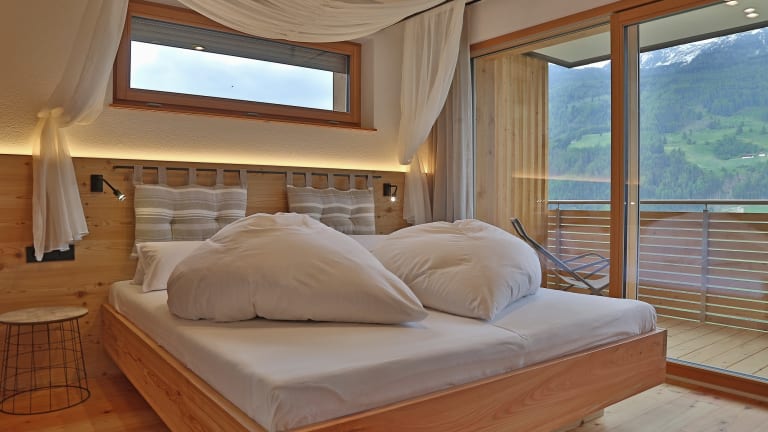 Die Zimmer mit den großen Glasfronten und Südbalkon gewähren Ausblick auf das Tal und die umliegende Bergwelt