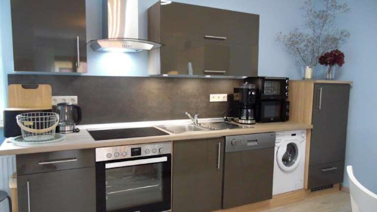 Die Ferienwohnung umfasst ein Schlafzimmer, eine Küchenzeile mit Kühlschrank und Geschirrspüler sowie ein Badezimmer mit Dusche, Haartrockner und Waschmaschine. Handtücher und Bettwäsche werden zur Verfügung gestellt.
