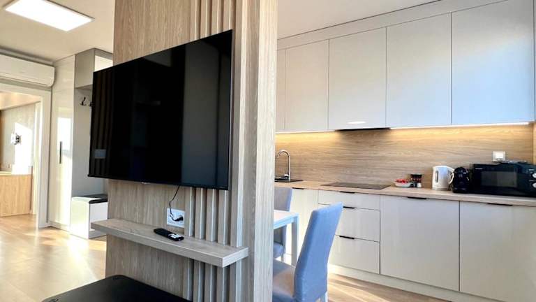 Die Ferienwohnung umfasst zwei Schlafzimmer, ein Wohnzimmer sowie eine voll ausgestattete Küche mit Kühlschrank und Kaffeemaschine. Das Badezimmer ist mit einer Dusche und einem Haartrockner ausgestattet. Handtücher und Bettwäsche werden bereitgestellt. Die Wohnung verfügt über Klimaanlage und bietet sowohl Nichtraucherzimmer als auch Familienzimmer. WLAN ist in allen Bereichen verfügbar.