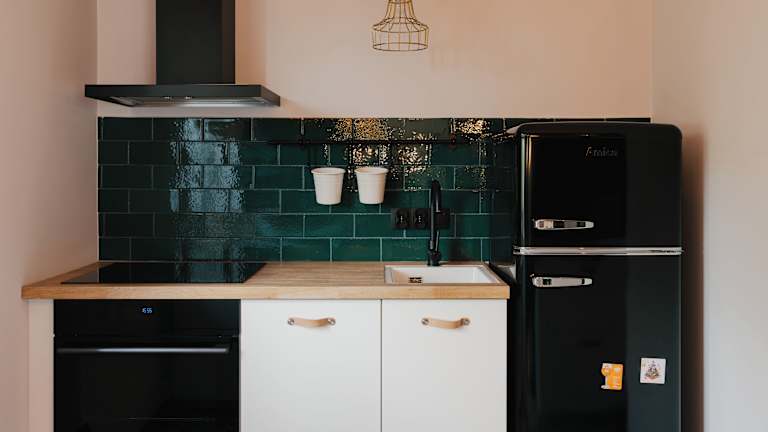 Die Ferienwohnung umfasst ein Schlafzimmer, eine Küchenzeile mit Kühlschrank und Mikrowelle sowie ein Badezimmer mit Dusche und Haartrockner. Handtücher und Bettwäsche sind ebenfalls vorhanden.