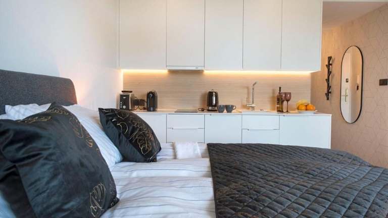 Die Unterkunft verfügt über eine klimatisierte Ferienwohnung mit einem Schlafzimmer, Kabel-Flachbild-TV und einer Küchenzeile, die mit einem Kühlschrank und einem Geschirrspüler ausgestattet ist. Handtücher und Bettwäsche werden bereitgestellt.