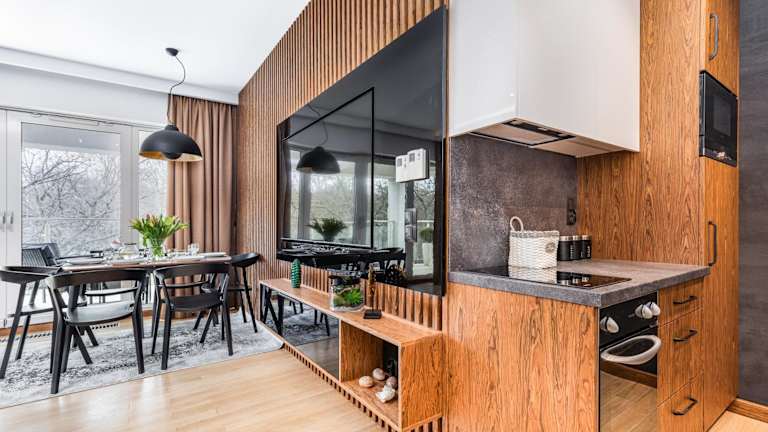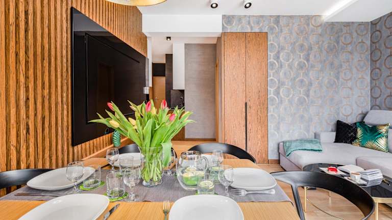 Die Ferienwohnung verfügt über zwei Schlafzimmer, ein Wohnzimmer mit einem Flachbild-TV und eine gut ausgestattete Küche, die mit einem Kühlschrank und einem Geschirrspüler ausgestattet ist. Das Badezimmer ist mit einer Dusche ausgestattet. Handtücher und Bettwäsche werden bereitgestellt.