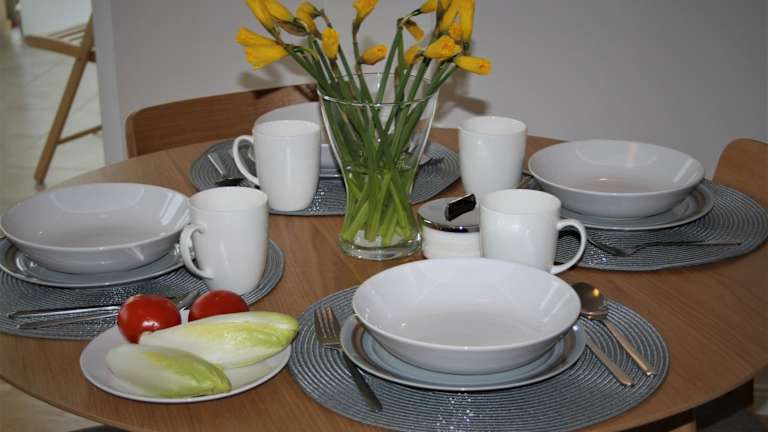 Die Ferienwohnung verfügt über zwei Schlafzimmer, ein Wohnzimmer, einen Flachbild-TV sowie eine gut ausgestattete Küchenzeile mit Kühlschrank und Geschirrspüler. Ein Badezimmer mit Dusche ist ebenfalls vorhanden. Handtücher und Bettwäsche werden bereitgestellt, und die Wohnung bietet eine Terrasse mit Bergblick.