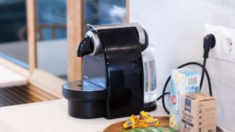 Die Ferienwohnung ist mit einer voll ausgestatteten Küche ausgestattet, die einen Kühlschrank und eine Kaffeemaschine umfasst. Weitere Verpflegungsmöglichkeiten sind nicht angegeben.