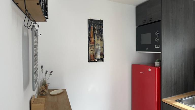 Das Apartment verfügt über ein Schlafzimmer, ein Wohnzimmer und eine voll ausgestattete Küche mit Kühlschrank und Kaffeemaschine. Das Badezimmer ist mit einer Dusche und einem Haartrockner ausgestattet. Handtücher und Bettwäsche werden bereitgestellt.
