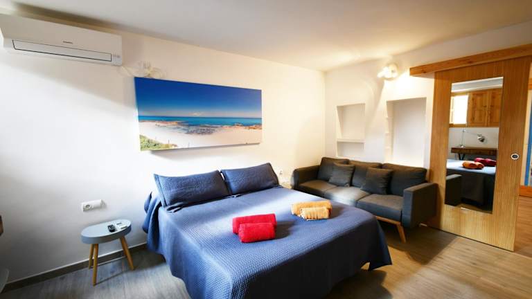 Die Apartamentos Cas Xurrac befinden sich nur 150 Meter vom Strand Ses Platgetes entfernt, so dass Sie die sonnigen Strände und das kristallklare Wasser in nur wenigen Schritten erreichen können. Das Städtchen Es Caló de Sant Agustí liegt ebenfalls in der Nähe und bietet eine Auswahl an Restaurants, Bars und Supermärkten, um Ihren Aufenthalt angenehm zu gestalten. Die Busstation in unmittelbarer Nähe ermöglicht es Ihnen, die anderen Teile der Insel bequem zu erkunden. Der Hafen von La Savina, von dem aus Sie mit der Fähre nach Ibiza oder Dénia fahren können, ist mit dem Auto in nur 15 Minuten zu erreichen.