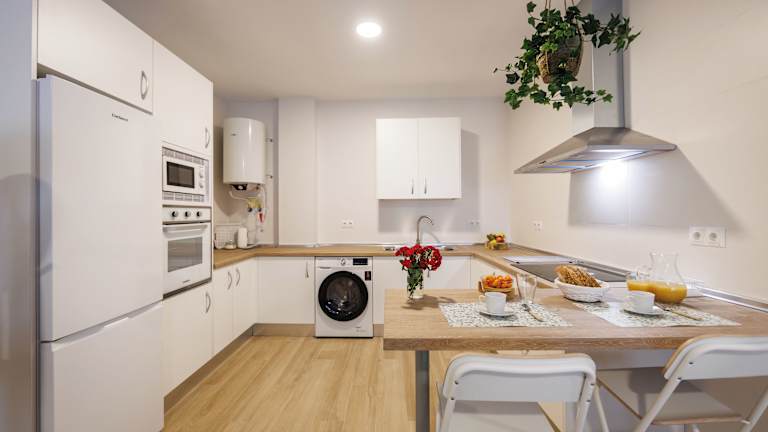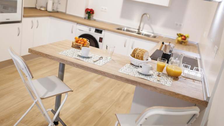 Die Apartments sind mit einer voll ausgestatteten Küche mit einem Essbereich ausgestattet. Zu den Küchengeräten gehören ein Kühlschrank, ein Ofen, eine Mikrowelle sowie eine Kaffeemaschine.